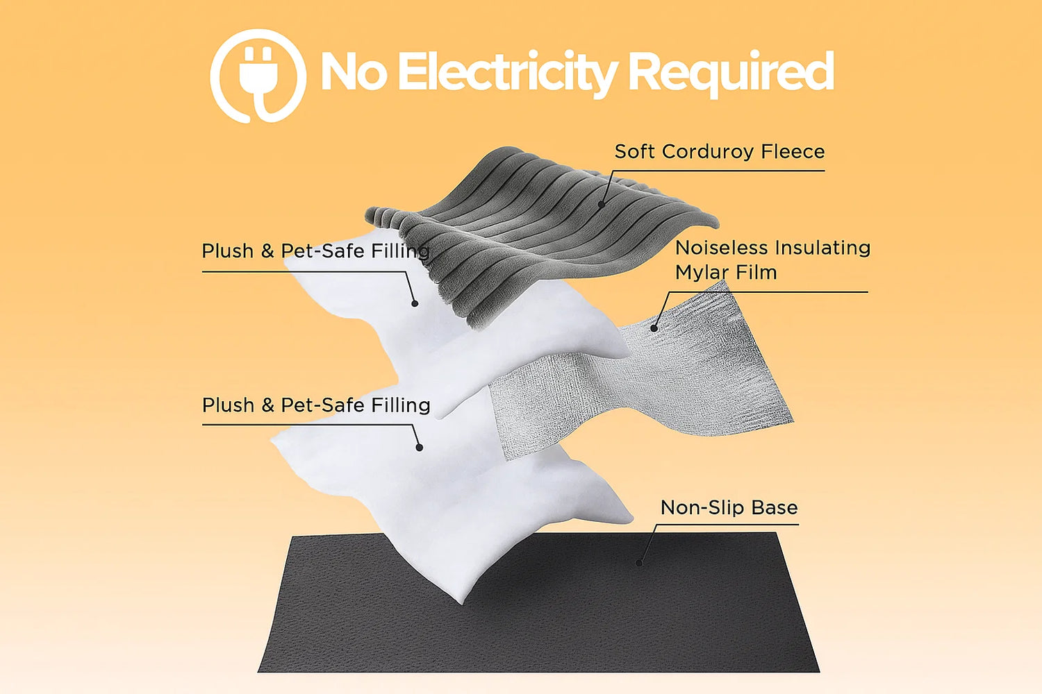 It reflects the pet’s own body heat using insulated materials—no electricity needed.